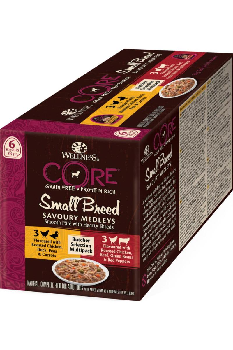 Wellness CORE Small Breed Savoury Medleys Butcher Multipack er naturlige, komplette og balanserte måltider med deilig smak og spennende konsistens, spesielt utviklet for hunder av små raser. Beriket med vitaminer og mineraler.