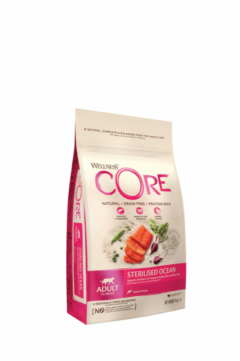 Wellness CORE Sterilised Ocean med laks er utviklet for å dekke behovene til steriliserte katter og bidrar til sunn hud og blank pels takket være garanterte omega 3- og 6-fettsyrer fra lakseolje.