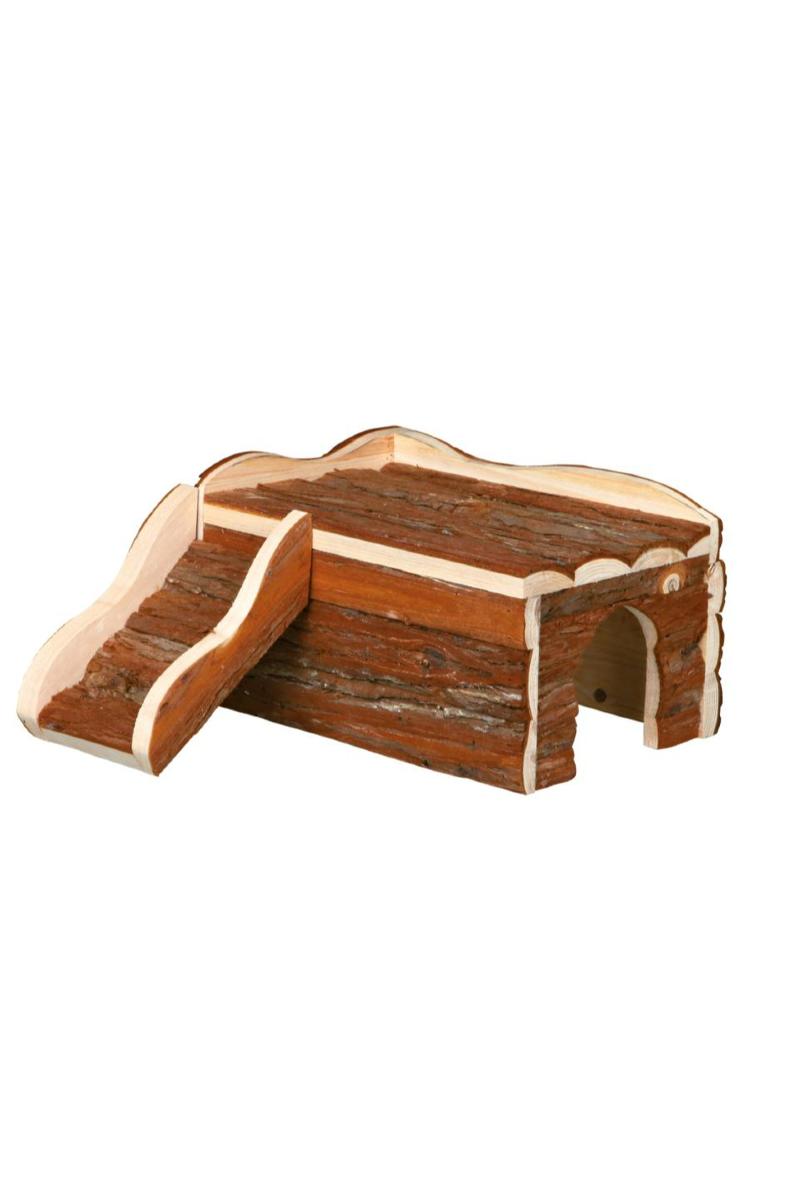 Dette gnagerhuset med to innganger og en utsiktsplass på taket er et naturparadis laget av tre med bark fra bartrær. Treet er omhyggelig bearbeidet, og de potensielt giftige harpikskanalene i treet elimineres når det gjennomgår en grundig tørkeprosess for å sikre at det ikke avgir harpiks. Limet som brukes i prosessen er giftfritt og består av en trygg blanding av mastiks og cellulose. Dette gnagerhuset kombinerer funksjonalitet og naturlig skjønnhet, og er laget av materialer som bidrar til kjæledyrenes velvære og sikkerhet. La dem utforske og glede seg over dette trygge og berikende hjemmet.