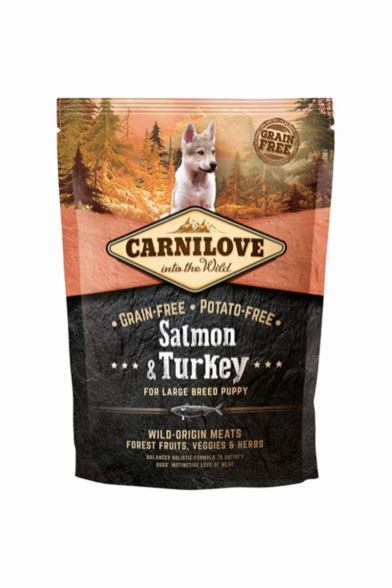 Salmon and Turkey. til hvalpe af store racer. KORNFRI og KARTOFFELFRI BLANDING til hvalpe AF STORE RACER (≥ 25 KG, 3-30 måneder). FULDFODER til HUNDE.Ingredienser: laksemel (25 %), kalkunmel (20 %), gule ærter (18 %), kyllingefedt (konserveret med tocopheroler, 9 %), laks uden ben (6 %), hydrolyseret fjerkræprotein (5 %), tapiokastivelse (5 %), æbler (3 %), kyllingelever (3 %), lakseolie (2 %), gulerødder (1 %), hørfrø (1 %), kikærter (1 %), hydrolyserede skaller fra krebsdyr (en kilde til glucosamin, 0,031 %), bruskekstrakt (en kilde til chondroitin, 0,019 %), ølgær (en kilde til mannan-oligosakkarider, 0,018 %), cikorierødder (en kilde til frukto-oligosakkarider, 0,012 %), yucca schidigera (0,011 %), alger (0,01 %), psylliumfrø (0,01 %), timian (0,01 %), rosmarin (0,01 %), oregano (0,01 %), tranebær (0,0008 %), blåbær (0,0008 %), hindbær (0,0008 %). tilsætningsstoffer med ernæringsmæssige egenskaber pr. kg: vitamin A (E672) 24.000 IE, vitamin D3 (E671) 1.600 IE, vitamin E (α-tocopherol) (3a700) 500 mg, zink (E6) 100 mg, jern (E1) 85 mg, mangan (E5) 40 mg, jod (E2) 0,75 mg, kobber (E4) 18 mg, selen (3b8.10) 0,28 mg. Analytiske bestanddele pr. kg: råprotein 38,0 %, fedtindhold 16,0 %, råaske 7,8 %, træstof 2,5 %, vand 10,0 %, calcium 1,3 %, fosfor 1,0 %.