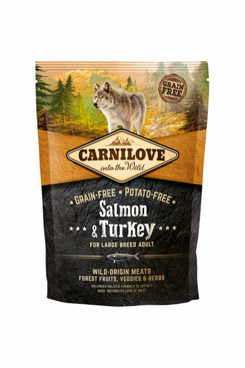 Salmon and Turkey. til store hunderacer ≥ 25 kgKornfri og kartoffelfri blanding til voksne hunde af store racer (= 25 kg). Fuldfoder til hunde. Ingredienser: laksemel (25 %), kalkunmel (20 %), gule ærter (20 %), kyllingefedt (konserveret med tocopheroler, 10 %), andemel (5 %), laks uden ben (5 %), kyllingelever (3 %), tapiokastivelse (3 %), æbler (3 %), lakseolie (2 %), gulerødder (1 %), hørfrø (1 %), kikærter (1 %), hydrolyserede skaller fra krebsdyr (en kilde til glucosamin, 0,05 %), bruskekstrakt (en kilde til chondroitin, 0,031 %), ølgær (en kilde til mannan-oligosakkarider, 0,015 %), cikorierødder (en kilde til frukto-oligosakkarider, 0,01 %), yucca schidigera (0,01 %), alger (0,01 %), psylliumfrø (0,01 %), timian (0,01 %), rosmarin (0,01 %), oregano (0,01 %), tranebær (0,0008 %), blåbær (0,0008 %), hindbær (0,0008 %). tilsætningsstoffer med ernæringsmæssige egenskaber pr. kg: vitamin A (E672) 20.000 IE, vitamin D3 (E671) 1.500 IE, vitamin E (a-tocopherol) (3a700) 400 mg, zink (E6) 85 mg, jern (E1) 70 mg, mangan (E5) 35 mg, jod (E2) 0,65 mg, kobber (E4) 15 mg, selen (3b8.10) 0,25 mg. Analytiske bestanddele pr. kg: råprotein 36,0 %, fedtindhold 16,0 %, råaske 7,8 %, træstof 3,0 %, vand 10,0 %, calcium 1,3 %, fosfor 1,0 %. Metaboliserbar energi 3 800 kcal/kg. Omega 3: 0,62 %, Omega 6: 2,2 %.