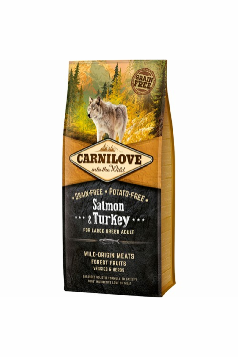 Salmon and Turkey. til store hunderacer ≥ 25 kgKornfri og kartoffelfri blanding til voksne hunde af store racer (= 25 kg). Fuldfoder til hunde. Ingredienser: laksemel (25 %), kalkunmel (20 %), gule ærter (20 %), kyllingefedt (konserveret med tocopheroler, 10 %), andemel (5 %), laks uden ben (5 %), kyllingelever (3 %), tapiokastivelse (3 %), æbler (3 %), lakseolie (2 %), gulerødder (1 %), hørfrø (1 %), kikærter (1 %), hydrolyserede skaller fra krebsdyr (en kilde til glucosamin, 0,05 %), bruskekstrakt (en kilde til chondroitin, 0,031 %), ølgær (en kilde til mannan-oligosakkarider, 0,015 %), cikorierødder (en kilde til frukto-oligosakkarider, 0,01 %), yucca schidigera (0,01 %), alger (0,01 %), psylliumfrø (0,01 %), timian (0,01 %), rosmarin (0,01 %), oregano (0,01 %), tranebær (0,0008 %), blåbær (0,0008 %), hindbær (0,0008 %). tilsætningsstoffer med ernæringsmæssige egenskaber pr. kg: vitamin A (E672) 20.000 IE, vitamin D3 (E671) 1.500 IE, vitamin E (a-tocopherol) (3a700) 400 mg, zink (E6) 85 mg, jern (E1) 70 mg, mangan (E5) 35 mg, jod (E2) 0,65 mg, kobber (E4) 15 mg, selen (3b8.10) 0,25 mg. Analytiske bestanddele pr. kg: råprotein 36,0 %, fedtindhold 16,0 %, råaske 7,8 %, træstof 3,0 %, vand 10,0 %, calcium 1,3 %, fosfor 1,0 %. Metaboliserbar energi 3 800 kcal/kg. Omega 3: 0,62 %, Omega 6: 2,2 %.