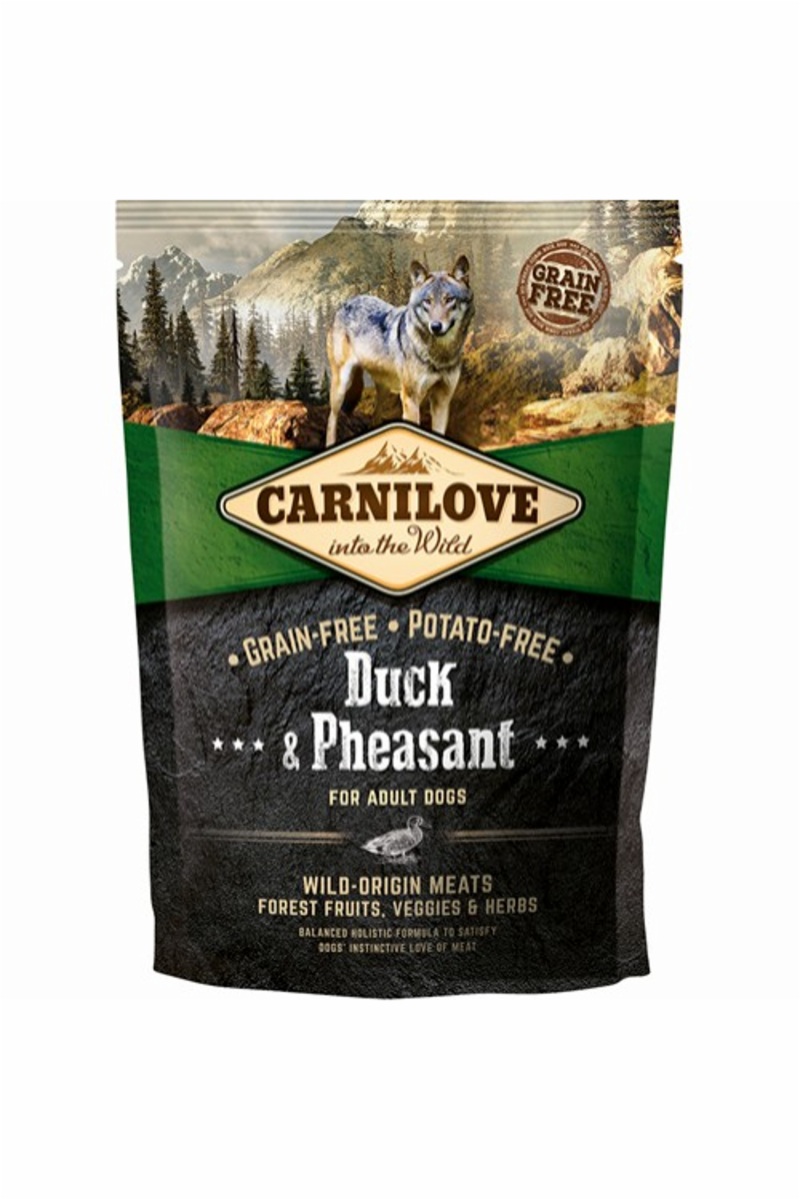 Duck Pheasant for Adult dogs Kornfri og kartoffelfri blanding til voksne hunde af alle racer. Fuldfolder til hunde. Ingredienser: andemel (30 %), fasanmel (22 %), gule ærter (20 %), kyllingefedt (konserveret med tocopheroler, 8 %), andekød uden ben (5 %), kyllingelever (3 %), æbler (3 %), tapiokastivelse (3 %), lakseolie (2 %), gulerødder (1 %), hørfrø (1 %), kikærter (1 %), hydrolyserede skaller fra krebsdyr (en kilde til glucosamin, 0,026 %), bruskekstrakt (en kilde til chondroitin, 0,016 %), ølgær (en kilde til mannan-oligosakkarider, 0,015 %), cikorierødder (en kilde til frukto-oligosakkarider, 0,01 %), yucca schidigera (0,01 %), alger (0,01 %), psylliumfrø (0,01 %), timian (0,01 %), rosmarin (0,01 %), oregano (0,01 %), tranebær (0,0008 %), blåbær (0,0008 %), hindbær (0,0008 %). tilsætningsstoffer med ernæringsmæssige egenskaber pr. kg: vitamin A (E672) 20.000 IE, vitamin D3 (E671) 1.500 IE, vitamin E (a-tocopherol) (3a700) 400 mg, zink (E6) 85 mg, jern (E1) 70 mg, mangan (E5) 35 mg, jod (E2) 0,65 mg, kobber (E4) 15 mg, selen (3b8.10) 0,25 mg. Analytiske bestanddele pr. kg: råprotein 37,0 %, fedtindhold 18,0 %, råaske 8,5 %, træstof 2,5 %, vand 10,0 %, calcium 1,8 %, fosfor 1,5 %. Metaboliserbar energi 3 900 kcal/kg. Omega 3: 0,33 %, Omega 6: 2,34 %.