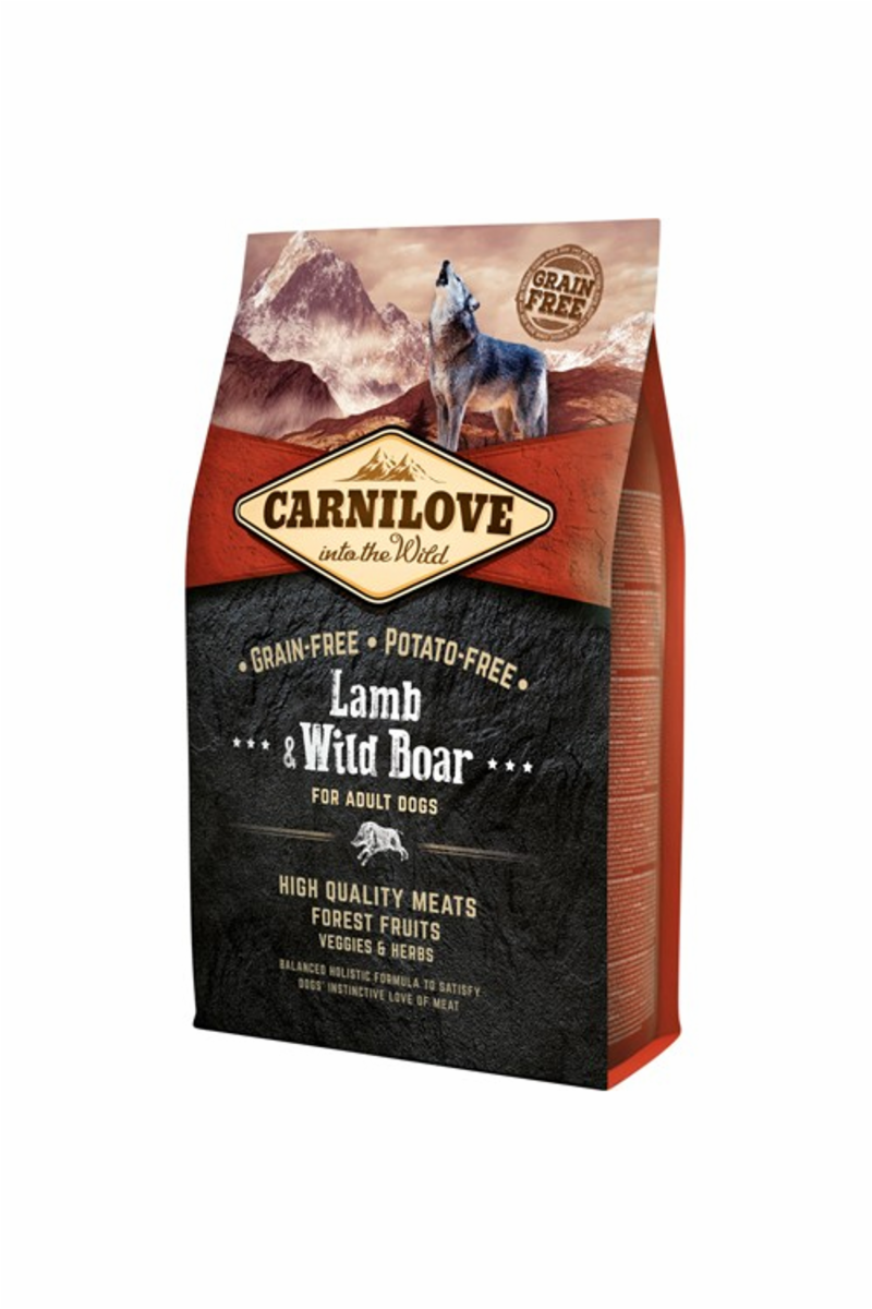 Lamb Wild Boar for Adult dogs. Kornfri og kartoffelfri blanding til voksne hunde af alle racer. Fuldfoder til hunde. Ingredienser: vildsvinemel (30 %), lammemel fra fritgående lam (25 %), gule ærter (20 %), kyllingefedt (konserveret med tocopheroler, 10 %), kyllingelever (3 %), æbler (3 %), tapiokastivelse (3 %), lakseolie (2 %), gulerødder (1 %), hørfrø (1 %), kikærter (1 %), hydrolyserede skaller fra krebsdyr (en kilde til glucosamin, 0,026 %), bruskekstrakt (en kilde til chondroitin, 0,016 %), ølgær (en kilde til mannan-oligosakkarider, 0,015 %), cikorierødder (en kilde til frukto-oligosakkarider, 0,01 %), yucca schidigera (0,01 %), alger (0,01 %), psylliumfrø (0,01 %), timian (0,01 %), rosmarin (0,01 %), oregano (0,01 %), tranebær (0,0008 %), blåbær (0,0008 %), hindbær (0,0008 %). tilsætningsstoffer med ernæringsmæssige egenskaber pr. kg: vitamin A (E672) 20.000 IE, vitamin D3 (E671) 1.500 IE, vitamin E (a-tocopherol) (3a700) 400 mg, zink (E6) 85 mg, jern (E1) 70 mg, mangan (E5) 35 mg, jod (E2) 0,65 mg, kobber (E4) 15 mg, selen (3b8.10) 0,25 mg. Analytiske bestanddele pr. kg: råprotein 38,0 %, fedtindhold 20,0 %, råaske 8,0 %, træstof 3,2 %, vand 10,0 %, calcium 1,6 %, fosfor 1,3 %. Metaboliserbar energi 3 950 kcal/kg. Omega 3: 0,35 %, Omega 6: 2,4 %.
