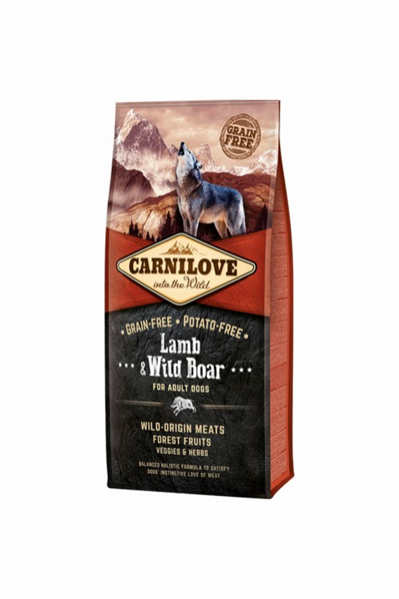 Lamb Wild Boar for Adult dogs. Kornfri og kartoffelfri blanding til voksne hunde af alle racer. Fuldfoder til hunde. Ingredienser: vildsvinemel (30 %), lammemel fra fritgående lam (25 %), gule ærter (20 %), kyllingefedt (konserveret med tocopheroler, 10 %), kyllingelever (3 %), æbler (3 %), tapiokastivelse (3 %), lakseolie (2 %), gulerødder (1 %), hørfrø (1 %), kikærter (1 %), hydrolyserede skaller fra krebsdyr (en kilde til glucosamin, 0,026 %), bruskekstrakt (en kilde til chondroitin, 0,016 %), ølgær (en kilde til mannan-oligosakkarider, 0,015 %), cikorierødder (en kilde til frukto-oligosakkarider, 0,01 %), yucca schidigera (0,01 %), alger (0,01 %), psylliumfrø (0,01 %), timian (0,01 %), rosmarin (0,01 %), oregano (0,01 %), tranebær (0,0008 %), blåbær (0,0008 %), hindbær (0,0008 %). tilsætningsstoffer med ernæringsmæssige egenskaber pr. kg: vitamin A (E672) 20.000 IE, vitamin D3 (E671) 1.500 IE, vitamin E (a-tocopherol) (3a700) 400 mg, zink (E6) 85 mg, jern (E1) 70 mg, mangan (E5) 35 mg, jod (E2) 0,65 mg, kobber (E4) 15 mg, selen (3b8.10) 0,25 mg. Analytiske bestanddele pr. kg: råprotein 38,0 %, fedtindhold 20,0 %, råaske 8,0 %, træstof 3,2 %, vand 10,0 %, calcium 1,6 %, fosfor 1,3 %. Metaboliserbar energi 3 950 kcal/kg. Omega 3: 0,35 %, Omega 6: 2,4 %.