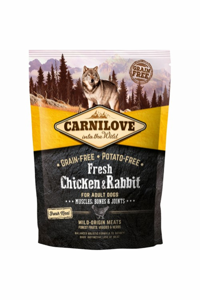 Fresh Chicken & Rabbit Muscles, Bones and JointsKornfri og kartoffelfri blanding med frisk kød til voksne hunde af alle racer. Fuldfoder til hunde.Carnilove Fresh Kylling & Kanin er skabt med respekt for hundens oprindelige natur for at give den et afbalanceret foder rigt på frisk kød i kombination med forskellige slags grøntsager, frugt og urter. En tilbagevenden til naturlig føde forbedrer hundens fordøjelse og fremmer den rigtige vækst af muskler og brusk. Muslinge-ekstrakt hjælper med at opretholde stærke knogler og sunde led. Kyllingekød er en fremragende kilde til essentielle aminosyrer og mineraler, som hjælper med at mineralisere knogler og led og bidrager til opbygningen og vedligeholdelsen af muskelmasse. I kombination med letfordøjelig protein fra kaninkød, der indeholder et minimum af fedt, gør den blandingen enestående og særdeles egnet for alle kødædere. Ingredienserfrisk kyllingekød, udbenet (40 %), tørret kanin (20 %), tørret and (10 %), græskar, kikærter, ærter, kyllingefedt (konserveret med tocopheroler, 5 %), kyllingelever (3 %), lakseolie (2 %), æbler, gulerødder, hørfrø, hydrolyserede skaller fra krebsdyr (en kilde til glucosamin, 0,026 %), bruskekstrakt (en kilde til chondroitin, 0,016 %), ølgær (en kilde til mannan-oligosaccharider, 0,015 %), cikorierødder (en kilde til fructo-oligosaccharider, 0,01 %), Yucca schidigera (0,01 %), alger (0,01 %), psylliumfrø (0,01 %), timian (0,01 %), rosmarin (0,01 %), oregano (0,01 %), tranebær (0,0008 %), blåbær (0,0008 %), havtorn (0,0008 %), ingefærrod (0,0008 %), salvie (0,0008 %).Tilsætningsstoffer med ernæringsmæssige egenskaber pr. kgvitamin A (3a672a) 20.000 IE, vitamin D3 (E671) 1.500 IE, vitamin E (α-tocopherol) (3a700) 400 mg, zinkaminosyrechelat-hydrat (3b606) 85 mg, jern-(II)-aminosyrechelat, hydrat (E1) 70 mg, mangan-(II)-aminosyrechelat, hydrat (E5) 35 mg, kaliumjodid (3b201) 0,65 mg, kobber-(II)-aminosyrechelat, hydrat (E4) 15 mg, organisk form for selen produceret af Saccharomyces cerevisiae CNCM I-3060 (3b8.10) 0,2 mg. Analytiske bestanddele pr. kgråprotein 35,0 %, fedtindhold 18,0 %, vand 10,0 %, råaske 8,5 %, træstof 3,5 %, calcium 1,4 %, fosfor 1,0 %, omega-3 0,6 %, omega-6 1,7 %, EPA (20:5 n-3) 0,08 %, DHA (22:6 n-3) 0,1 %.Weight of dog (kg) 5 10 15 20 25 30 40 50 60 70 80 90Daily consumption (g) 75 130 170 200 250 280 350 410 470 530 580 640 Metaboliserbar energi3 820 kcal/kg