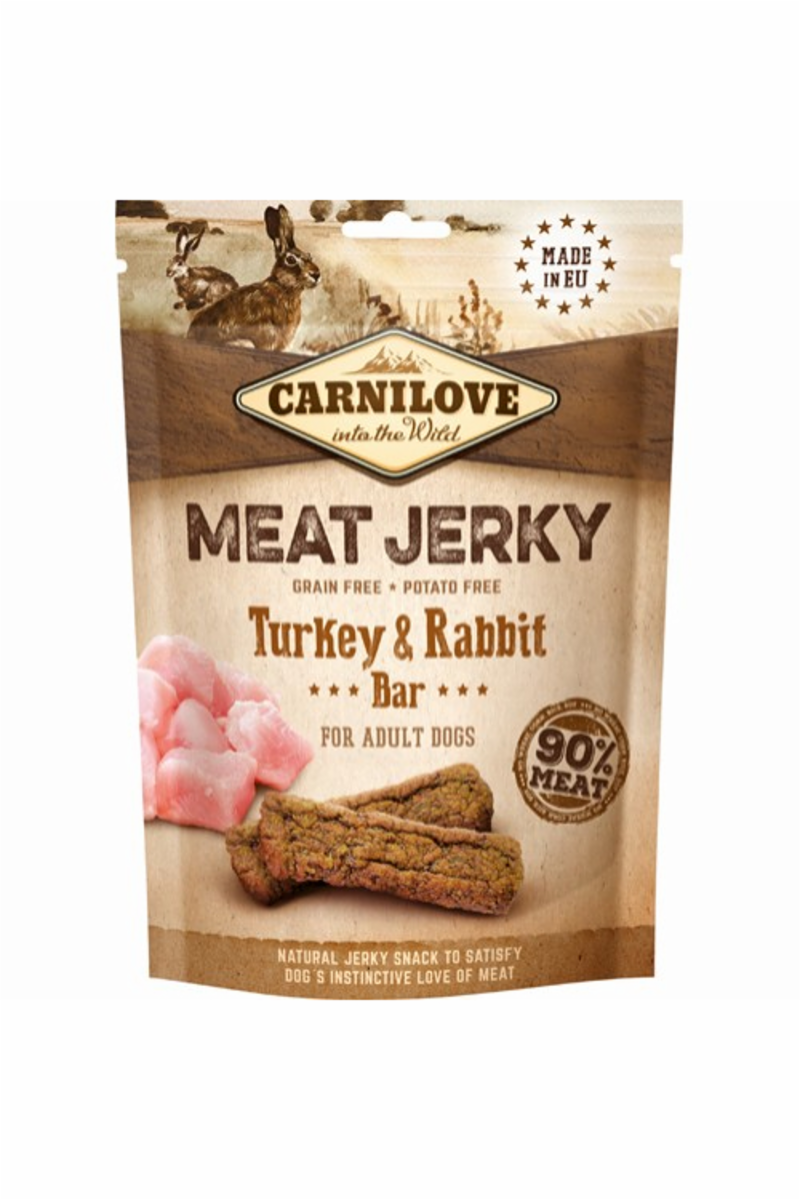 Carnilove Jerky Snack Turkey & Rabbit Bar (Carnilove Jerky Snack Stang med kalkun & kanin) Tørrede godbidder af kød – Proteinstang med kalkun og kanin Tilskudsfoder til voksne hunde. · 90 % kød · Uimodståelig smag · Kun naturlige antioxidanter · Uden korn – Uden farvestoffer – Uden sukker – Uden GMO – Fremstillet i EU Sammensætning: kalkun (64 %), kanin (26 %), glycerin af vegetabilsk oprindelse, blåbær (1 %), natriumchlorid. Analytiske bestanddele: råprotein 33,0 %, råfedt 22,0 %, vand 18,0 %, råaske 5,5 %, træstof 2,0 %. Fodringsvejledning: Carnilove Jerky Snack er et sundt, kødrigt og velsmagende supplement til din hunds regelmæssige kost. Giv dagligt som belønning eller som en godbid, når I har tid sammen i løbet af dagen. Sørg for, at din hund har adgang til frisk drikkevand. Brug ikke som fuldfoder. Vær opmærksom på den rigtige dosering, og giv ikke for meget foder. Naturlige antioxidanter: rosmarinekstrakt og tokoferolekstrakter fra vegetabilske olier (1b306(i)). Mindste holdbarhed / partiets referencenr.: se stempel: Opbevares køligt og tørt, beskyt mod direkte sollys.