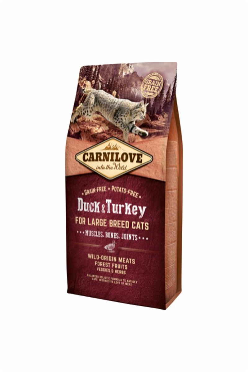 Duck Turkey for large breed cats Kornfri og Kartoffelfri blanding til katte af store racer.Forbedrer muskler, knogler og led hos katte af store racer, f.eks. Maine coon ogNorsk skovkat. Ingredienser: andemel (32 %), kalkunmel (18 %), gule ærter (16 %), kyllingefedt (konserveret med tocopheroler, 11 %), æbler (6 %), andekød uden ben (5 %), tapiokastivelse (3 %), kyllingelever (3 %), lakseolie (1 %), gulerødder (1 %), hørfrø (1 %), kikærter (1 %), olivenolie (0,8 %), grønlæbet musling (Perna canaliculus, 0,1 %), ekstrakt fra grøn te (0,1 %), hydrolyserede skaller fra krebsdyr (en kilde til glucosamin, 0,026 %), bruskekstrakt (en kilde til chondroitin, 0,016 %), ølgær (en kilde til mannan-oligosakkarider, 0,016 %), cikorierødder (en kilde til frukto-oligosakkarider, 0,012 %), yucca schidigera (0,01 %), alger (0,01 %), psylliumfrø (0,01 %), timian (0,01 %), rosmarin (0,01 %), oregano (0,01 %), tranebær (0,0008 %), blåbær (0,0008 %), hindbær (0,0008 %). tilsætningsstoffer med ernæringsmæssige egenskaber pr. kg: vitamin A (E672) 23.000 IE, vitamin D3 (E671) 940 IE, vitamin E (3a700) 650 IE, vitamin C (E300) 300 mg, taurin 2.400 mg, cholinchlorid 2.200 mg, L-carnitin 65 mg, niacin 45 mg, biotin 1,8 mg, zink (E6) 150 mg, mangan (E5) 55 mg, jern (E1) 48 mg, kobber (E4) 11 mg, jod (E2) 3,8 mg, selen (E8) 0,23 mg, DL-methionin (3.1.1.) 14 mg, arginin (3c3.6.1) 12 mg, L-lysin (3.2.3.) 10 mg. Analytiske bestanddele pr. kg: råprotein 37,0 %, fedtindhold 18,0 %, træstof 3,0 %, råaske 7,5 %, vand 10,0 %, calcium 1,3 %, fosfor 1,0 %, natrium 0,3 %, magnesium 0,05 %. Metaboliserbar energi 3 950 kcal/kg. Omega 3: 0,25 %, Omega 6: 2,50 %.
