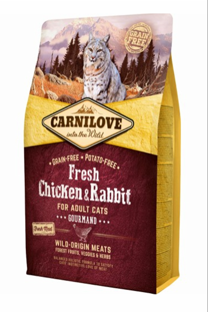 Fresh Chicken & Rabbit GourmandKornfri og kartoffelfri blanding med frisk kød til voksne katte. Fuldfoder til katte.Som unikke og uafhængige skabninger er katte kødædere, fuldblods rovdyr, hvis måde at leve på er bestemt af stærke jagtinstinkter. Carnilove Fresh Kylling & Kanin til voksne katte er skabt med respekt for den naturlige sammensætning af kattens føde og giver vores ven katten et afbalanceret foder rig på frisk kød i kombination med forskellige slags grøntsager, skovbær og urter. En tilbagevenden til naturlig føde fremmer en sund fordøjelse og hjælper med at opretholde en optimal fysisk form. De allerbedste naturlige råvarer i kombination med en uimodståelig smag af frisk kød kan selv de største katte-gourmeter lide. Ingredienserfrisk kyllingekød, udbenet (42 %), tørret kanin (22 %), tørret and (6 %), kyllingefedt (konserveret med tocopheroler, 5 %), græskar, kikærter, ærter, kyllingelever (3 %), lakseolie (2 %), æbler, gulerødder, hørfrø, hydrolyserede skaller fra krebsdyr (en kilde til glucosamin, 0,026 %), bruskekstrakt (en kilde til chondroitin, 0,016 %), ølgær (en kilde til mannan-oligosaccharider, 0,015 %), cikorierødder (en kilde til fructo-oligosaccharider, 0,012 %), Yucca schidigera (0,01 %), alger (0,01 %), psylliumfrø (0,01 %), timian (0,01 %), rosmarin (0,01 %), oregano (0,01 %), tranebær (0,0008 %), blåbær (0,0008 %), havtorn (0,0008 %), ingefærrod (0,0008 %), salvie (0,0008 %). Tilsætningsstoffer med ernæringsmæssige egenskaber pr. kgvitamin A (3a672a) 23.000 IE, vitamin D3 (E671) 940 IE, vitamin E (α-tocopherol) (3a700) 650 mg, vitamin C (3a312) 300 mg, taurin (3a370) 2.400 mg, cholinchlorid (3a890) 2.200 mg, L-carnitin (3a910) 65 mg, niacinamid (3a315) 45 mg, biotin (3a880) 1,8 mg, zinkaminosyrechelat-hydrat (3b606) 100 mg, jern-(II)-aminosyrechelat, hydrat (E1) 48 mg, mangan-(II)-aminosyrechelat, hydrat (E5) 55 mg, kaliumjodid (3b201) 3,8 mg, kobber-(II)-aminosyrechelat, hydrat (E4) 11 mg, organisk form for selen produceret af Saccharomyces cerevisiae CNCM I-3060 (3b8.10) 0,2 mg, L-methionin (3c305) 14 mg, arginin (3c3.6.1.) 12 mg, L-lysin (3.2.3.) 10 mg. Analytiske bestanddele pr. kgråprotein 39,0 %, fedtindhold 18,0 %, vand 10,0 %, råaske 8,0 %, træstof 3,0 %, calcium 1,2 %, fosfor 1,0 %, natrium 0,4 %, magnesium 0,09 %, omega-3 0,5 %, omega-6 1,8 %, EPA (20:5 n-3) 0,09 %, DHA (22:6 n-3) 0,12 %.Weight of cat (kg) 2-3 3-5 5-7 7-9Amount (g) 35-50 50-65 65-85 85-95 Metaboliserbar energi3 910 kcal/kg