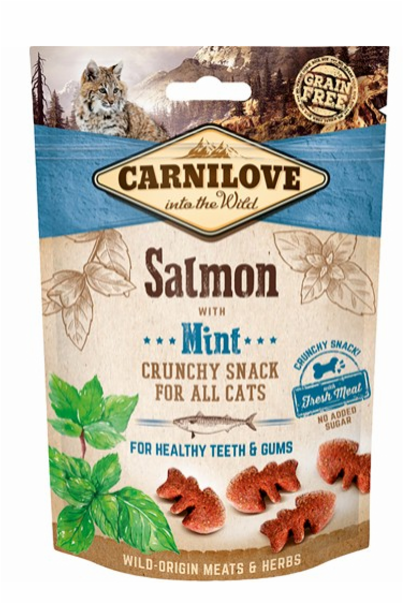Carnilove Crunchy Snack Salmon & Mint with fresh meat Lækker laksesnack velegnet til alle katte Med agermynte for sunde tænder og tandkød Tilskudsfoder til katte Sammensætning: laks 55 % (40 % tørret laks, 15 % frisk laks), græskar 12 %, gule ærter 8 %, kyllingefedt (konserveret med tocopheroler 7 %), laksesovs 5 %, mynte 4 %, gulerødder 2 %, kikærter 2 %, tørrede æbler 2 %, hørfrø 2 %, hørfrøolie 1 %. Fodringsvejledning: brug sprøde snacks som belønning, så du opbygger et stærkt forhold til din kat. Servér snacken fra hånden, og nyd en særlig stund sammen. Glem ikke at have en skål med frisk vand tilgængelig for din kat. Analytiske bestanddele: råprotein 38,0 %, fedtindhold 15,0 %, vand 10,0 %, råaske 9,0 %, træstof 2,8 %, calcium 1,4 %, fosfor 1,1 %, omega-3 0,8 %, omega-6 1,8 %. Indeholder naturlige antioxidanter. Metaboliserbar energi: 3.750 kcal/kg Skal anvendes inden den dato, der er angivet på emballagen. Opbevares tørt og køligt. Undgå direkte sollys. Luk igen efter åbning.