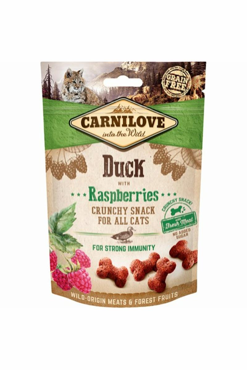 Carnilove Crunchy Snack Duck & Raspberries with fresh meat Lækker andesnack velegnet til alle katte Med skovhindbær, en naturlig kilde til antioxidanter for et stærkt immunforsvar Tilskudsfoder til katte Sammensætning: and 55 % (40 % tørret and, 15 % frisk and), græskar 12 %, gule ærter 8 %, kyllingefedt (konserveret med tocopheroler, 7 %), andesovs 5 %, hindbær 4 %, gulerødder 2 %, kikærter 2 %, tørrede æbler 2 %, hørfrø 2 %, hørfrøolie 1 %. Fodringsvejledning: brug sprøde snacks som belønning, så du opbygger et stærkt forhold til din kat. Servér snacken fra hånden, og nyd en særlig stund sammen. Glem ikke at have en skål med frisk vand tilgængelig for din kat. Analytiske bestanddele: råprotein 40,0 %, fedtindhold 16,0 %, vand 10,0 %, råaske 7,5 %, træstof 3,0 %, calcium 1,6 %, fosfor 1,2 %, omega-3 0,2 %, omega-6 1,9 %. Indeholder naturlige antioxidanter. Metaboliserbar energi: 3.850 kcal/kg Skal anvendes inden den dato, der er angivet på emballagen. Opbevares tørt og køligt. Undgå direkte sollys. Luk igen efter åbning.