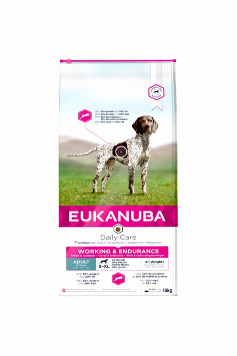 Til aktive hunde, og hunde som trænger til ekstra energi Højt indhold af protein (30%) og fedt (20%) Omega 3 & 6 balance for at forbedre lugtesansen Anbefales til drægtige og diegivende tæver Fersk kylling tilsat for at øge smageligheden. Ny teknologi: kompleksdannelse af mineraler: gør at mineralerne lettere optages i kroppen Tilsat DHA (som i hvalpefoder). Vigtig for drægtighed og diegivning. Tilsat L-carnitine for at forbrænde fedt EUKANUBA Daily Care Working and Endurance til hunde med et højt energi- og næringsbehov for at fremme et vedvarende energiniveau, så disse hunde kan yde maksimalt. Det høje indhold af protein (30 %) og fedt (20 %) understøtter meget aktive hunde og arbejdshunde og øger deres udholdenhed. Omega-3 og -6 for blandt andet at fremme god lugtesans. Anbefales også til drægtige og diegivende tæver. Specialudviklede sekskantsformede foderpiller med DentaDefense til at hjælpe med at holde tænderne rene og sunde. Eukanuba Daily Care Working and Endurance til arbejdshunde indeholder fersk kylling til at fremme magre og stærke muskler. Dette fuldfoder har et 100 % afbalanceret næringsindhold og er ideelt til voksne hunde af alle racer. Tørret kylling og kalkun (25% indeholder 15% kylling, naturlig kilde til glucosamin og chondroitinsulfat), fersk kylling (21%), majs, svinefedt, hvede, ris, durra, tørret roepulp (2.9%), fiskemel, kyllingesovs, mineralstoffer (indeholder natrium hexametafosfat 0.33%), tørrede hele æg, ølgær, fiskeolie, hørfrø, fructooligosaccharider (0.3%).