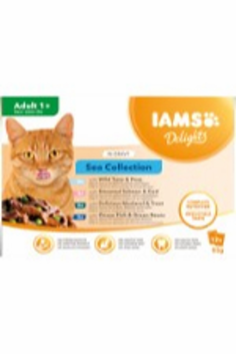 IAMS Delights våtfôr i saus er 100 % komplett og balansert våtfôr for voksne katter i en praktisk flerpakning med 4 havsmaker.