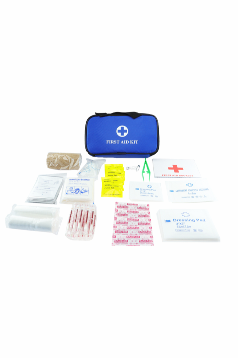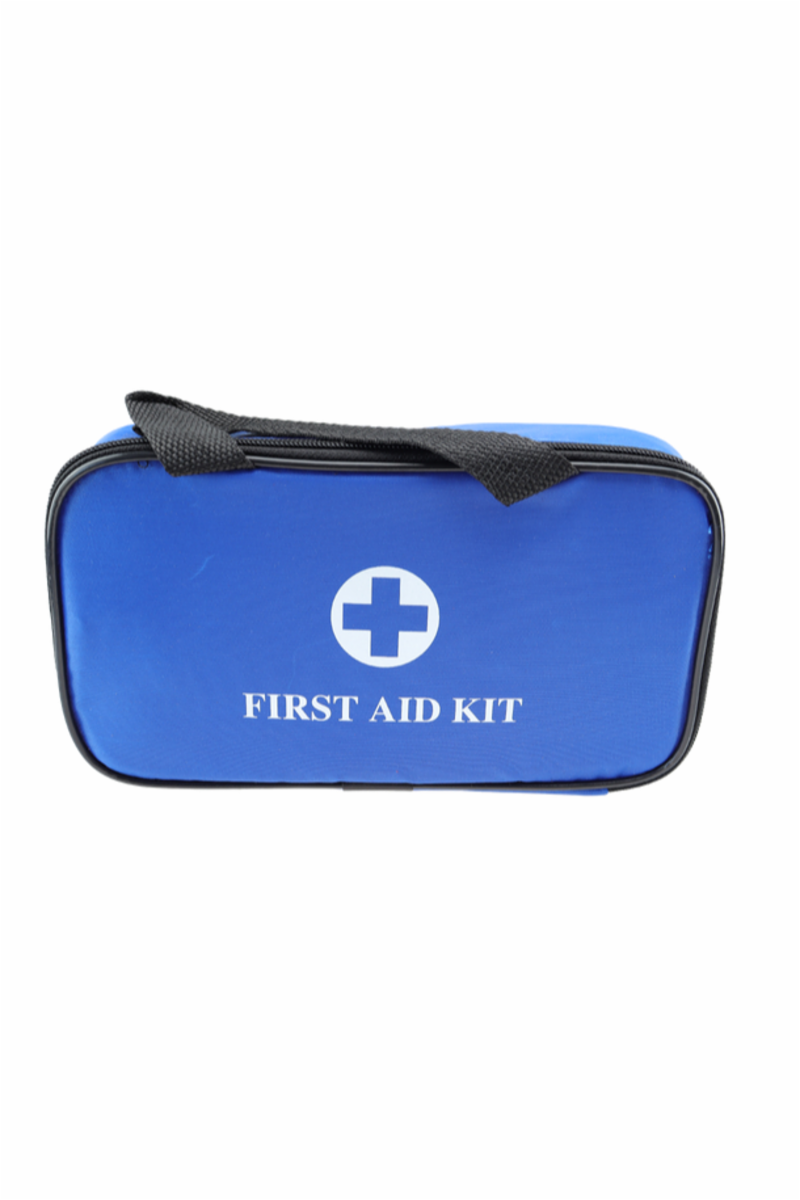 Inneholder et bra utvalg plaster, bandasjer, saks, pinsett, termometer etc.