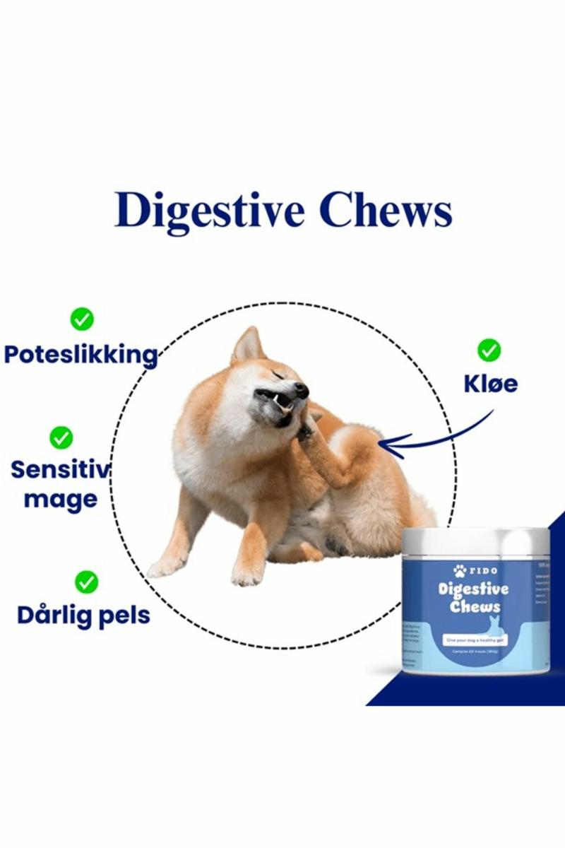 Visste du at mange kjente problemer hos hunder – som oppblåsthet, diaré, allergier og kløe – ofte kan spores tilbake til tarmhelsen og mangel på probiotika? Hundens tarm er som et lite økosystem, fullt av gode bakterier som holder alt i balanse. Fido Digestive Chews kombinerer helse og smak i en perfekt balanse. Disse velsmakende godbitene er proppfulle av probiotika og prebiotika som støtter fordøyelsen og kan lindre mageproblemer, styrke immunforsvaret og forbedre hud og pelskvalitet hos vofsen din. Godbitene kan gis som en belønning under trening, etter måltider eller bare for å vise at du bryr deg. Perfekt som daglig støtte med smak og helse i én deilig hjerteformet godbit!