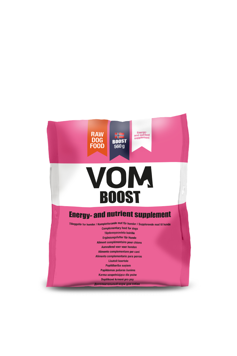 VOM Boost er et energi- og næringstilskudd for aktive hunder. Produktet er kategorisert som tilleggsfôr, laget av kyllingskinn. VOM Boost inneholder mye fett, og animalsk fett inneholder over dobbelt så mye energi som proteiner og karbohydrater. Dette er et energirikt produkt og inneholder hele 3310 kcal/kg.