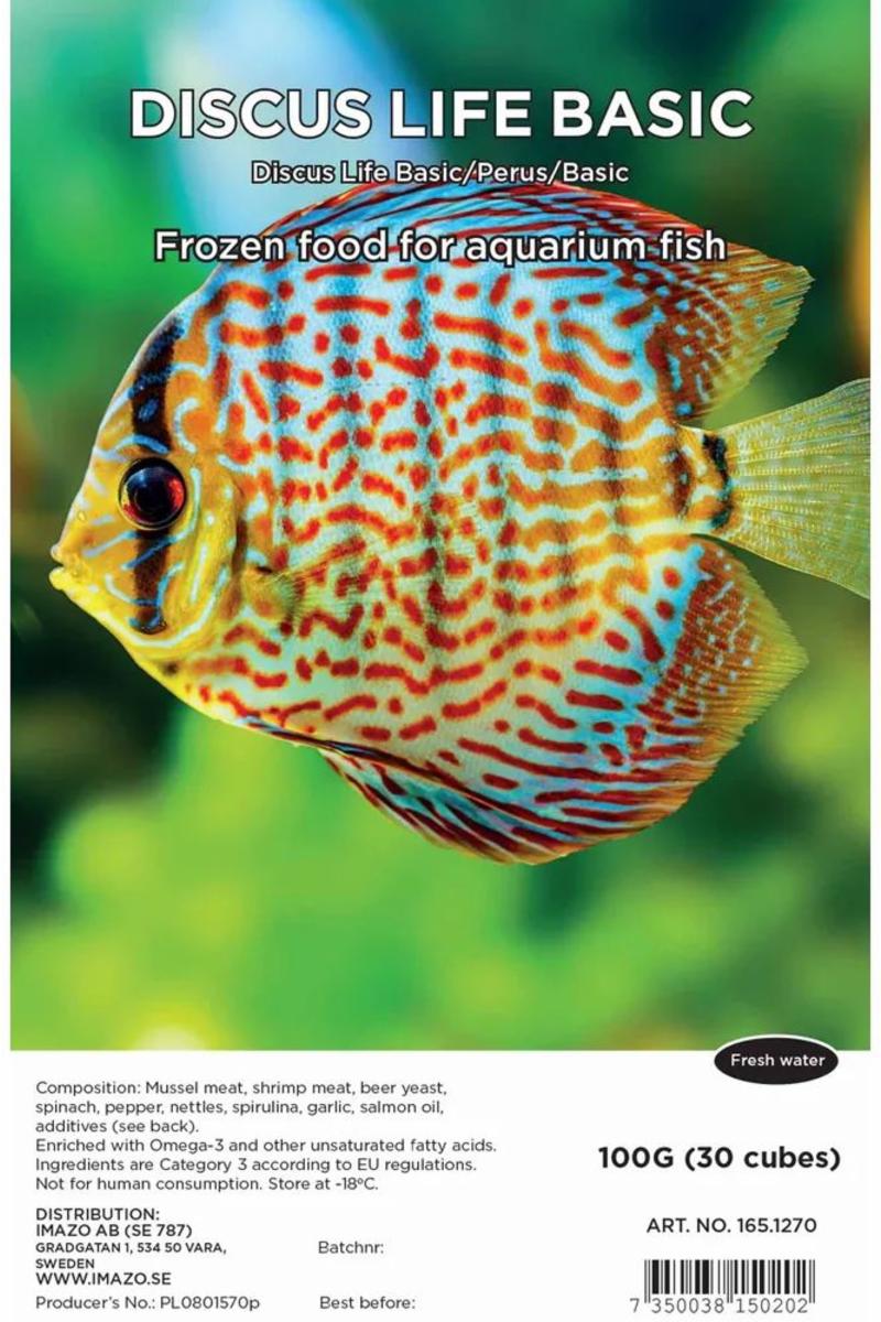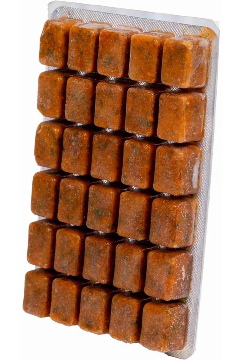 Blanding av laks, blåskjell, reker, mysis, artemia, hummeregg, spinat, naturlig astaxanthin, spirulina og hvitløk. Blisterpakning à 30 terninger.