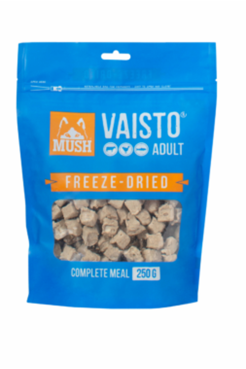 MUSH Vaisto Blå Frysetørket (Okse-kalkun-laks) er et frysetørket helfôr for hunder med samme høye næringsverdi og kvalitet som vanlig råfôr. Takket være at fôret er frysetørket, har det lav vekt og tar liten plass, samtidig som produksjonsmetoden bevarer smaken og næringsstoffene - perfekt å ta med på reiser, utstilling, konkurranser og turgåing.