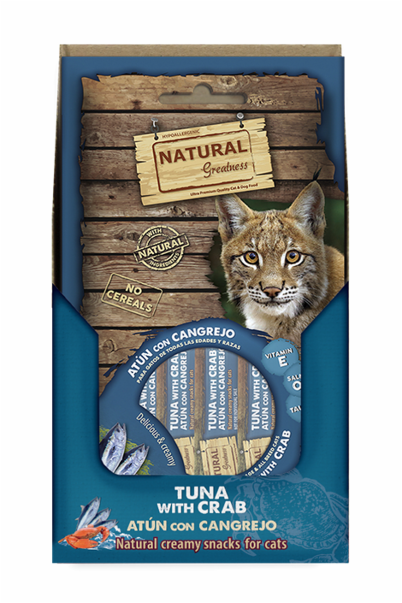 Natural Greatness Tuna and Crab Cream er en jevn, kremet kornfri snack som inkluderer førsteklasses tunfisk og krabbe og er beriket med taurin, vitamin E og lakseolje for å hjelpe katten din å opprettholde sunn hud og en silkemyk, skinnende pels.