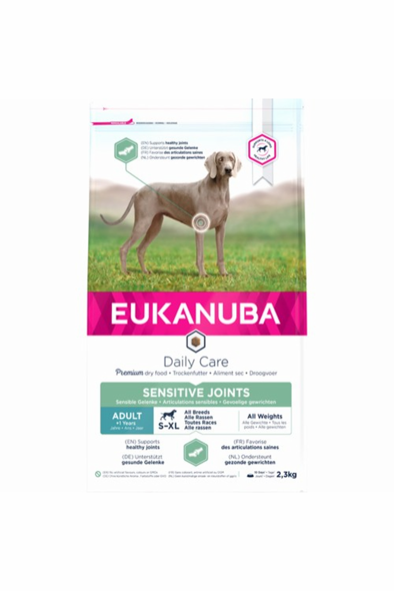 Til hunde med ledproblemer eller for at forebygge ledproblemer Glukosamin & chondroitin til vedligehold af sunde led og mobilitet Indeholder L-carnitine (fedtforbrænder) for sund vægt Tilsat MSM (Methyl Sulphonyl Methane); studier viser at MSM kan have en antiinflammatorisk effekt Ny teknologi: kompleksdannelse af mineraler: gør at mineralerne lettere optages i kroppen Eukanuba Daily Care Sensitive Joints til hunde med følsomme led, som lider af ledsmerter. Foderet er beriget med glucosamin og chondroitin for at hjælpe med at holde leddene sunde og understøtte aktiv mobilitet. Samtidig hjælper L-carnitin en sund vægtstyring og mindsker belastningen af leddene. Foderpillernes særlige sekskantede facon med den unikke DentaDefense hjælper med at holde tænderne rene og sunde. Eukanuba Daily Care Sensitive Joints til hunde med følsomme led indeholder fersk kylling til at opretholde magre og stærke muskler. Den skræddersyede fiberblanding af præbiotika og roemasse fremmer også sund fordøjelse. Foderet er 100 % komplet og afbalanceret og er ideel til voksne hunde af alle racer. Tørret kylling og kalkun (23%), majs, hvede, byg, durra, fersk kylling (4%), svinefedt, tørret roepulp (2.8%), kyllingesovs, mineralstoffer (indeholder natrium hexametafosfat 0.37%), tørrede hele æg, fiskemel, fiskeolie, hørfrø, fructooligosaccharider (0.27%), methylsulfonylmethan (0.13%), ølgær, glucosamin (fra dyrevæv) (562mg/kg), chondroitinsulfat (56mg/kg).