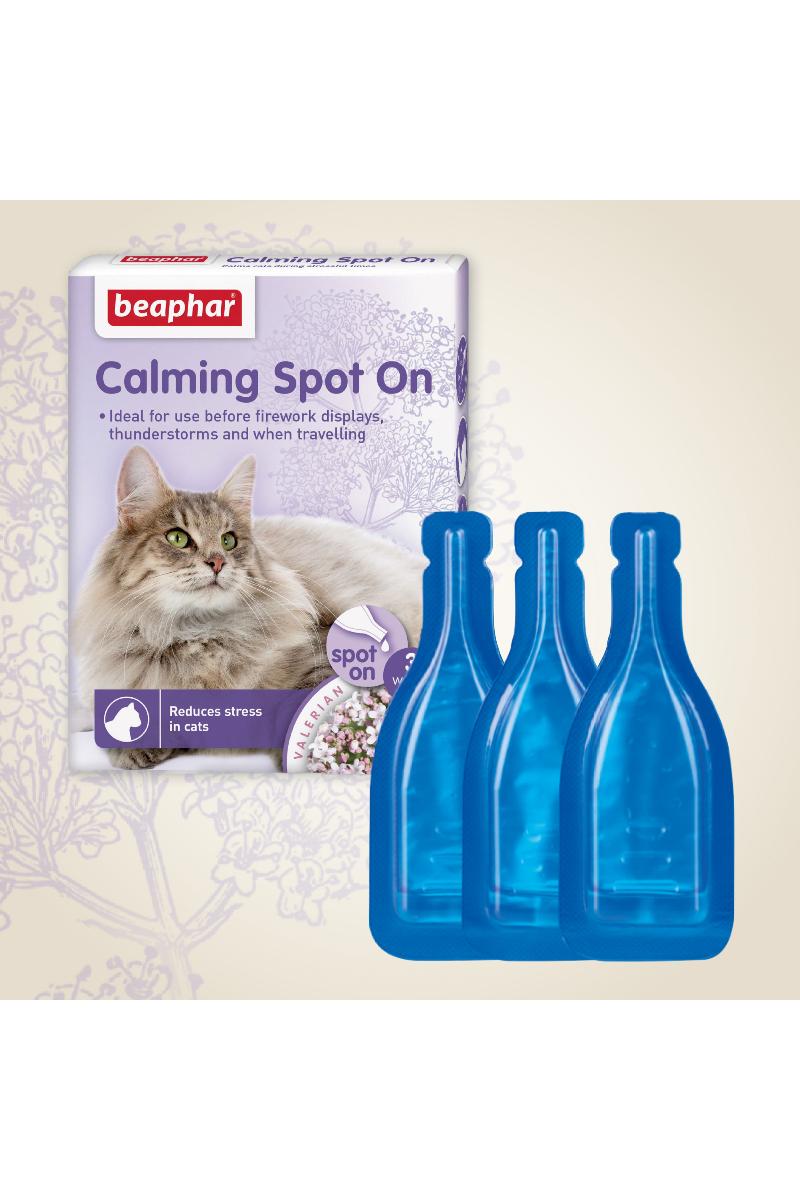 Naturlig og effektivt roer og reduserer problematferd hos katter av alle raser og aldre. Inneholder Valerian ekstrakt som enkelt kan roe ned katten i opptil én uke. Beaphar Calming Spot On for katter kan bidra til å lindre problemersom overdreven mjauing, destruktiv atferd og upassende markering. Det vil også bidra til at katten føler seg mindre bekymret ved veterinærbesøk, under fyrverkeri og tordenvær eller ved lengre bilturer.