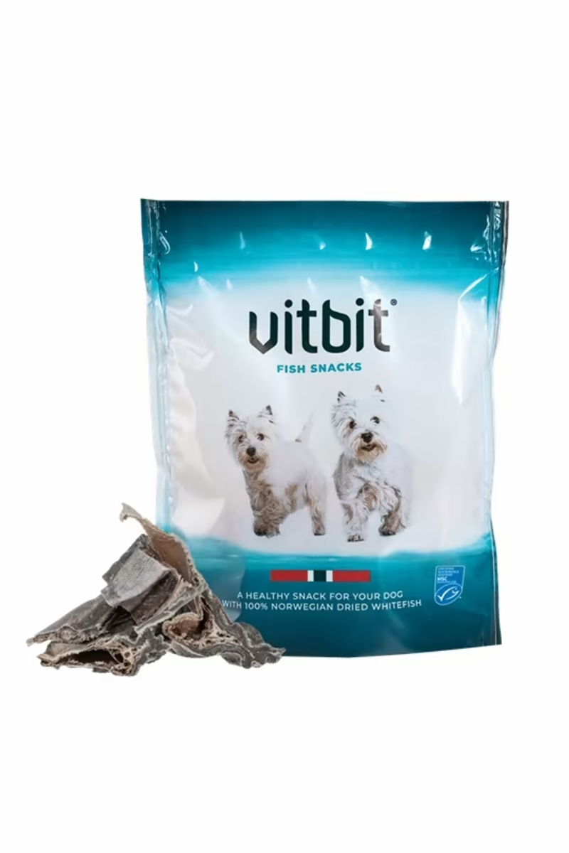 Vitbit Fish Snacks er en sunn hundesnacks av 100% naturlig tørket norsk sei, uten tilsetningsstoffer. Fisk er en av de rikeste naturlige kildene til Omega-3, som er godt for både pelsen, huden og leddene til hunder. Det er også en god proteinkilde som er enkel å fordøye, sammenlignet med enkelte typer kjøtt. I tillegg har fisk og annen sjømat lavt innhold av mettet fett og tomme kalorier. Vitbit Fish Snacks bidrar og til å forebygge plakk og tannstein. 100g Vitbit Fish Snacks tilsvarer 500g fersk fisk. Tørrfisken i 300g posen er ferdig kappet i store porsjonsbiter som passer til mellomstore og store hunder. Gis som en godbit eller belønning.